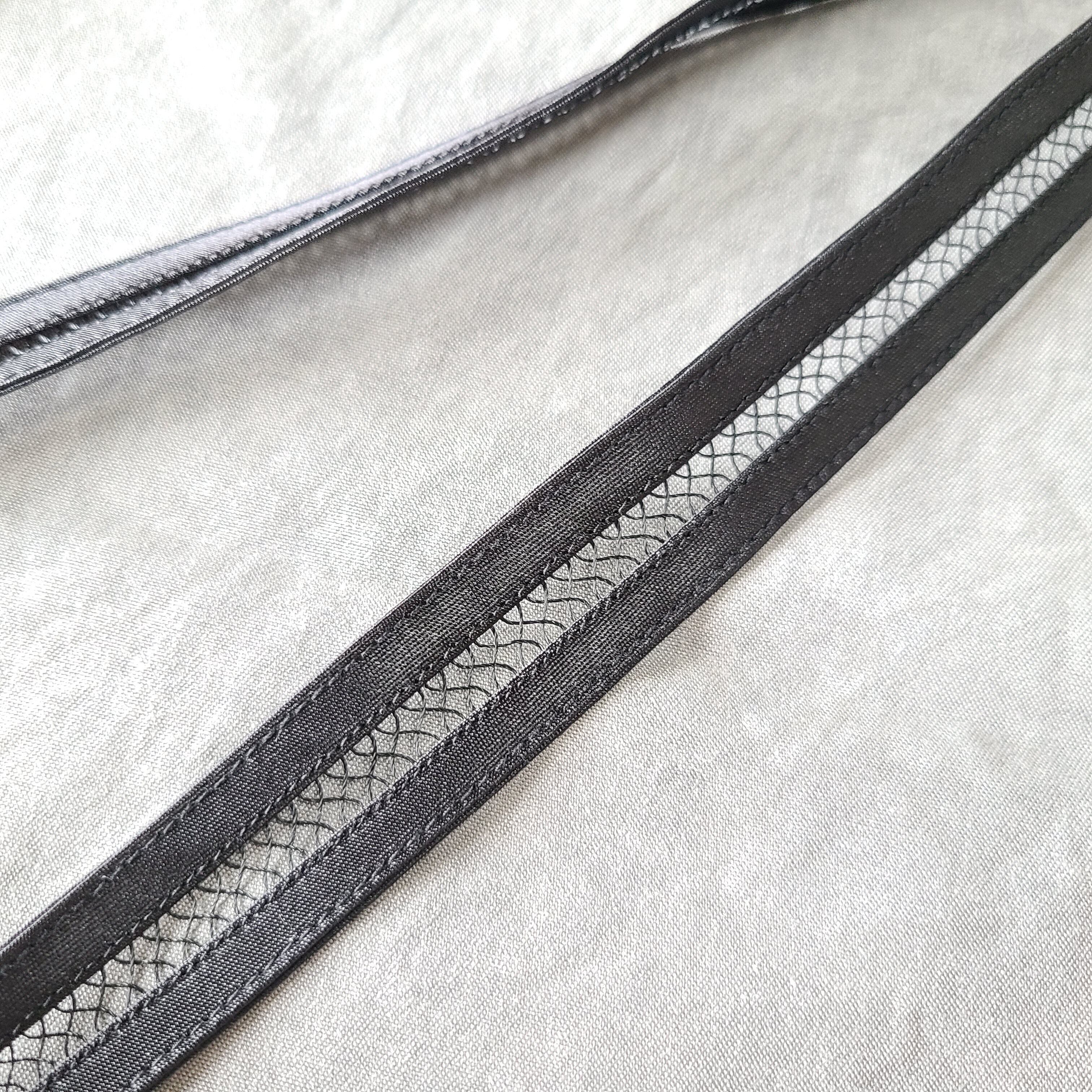 全てゴムのサスペンダーよりも長さ調節の距離が短く、サテンテープ部分は伸縮性がありません。