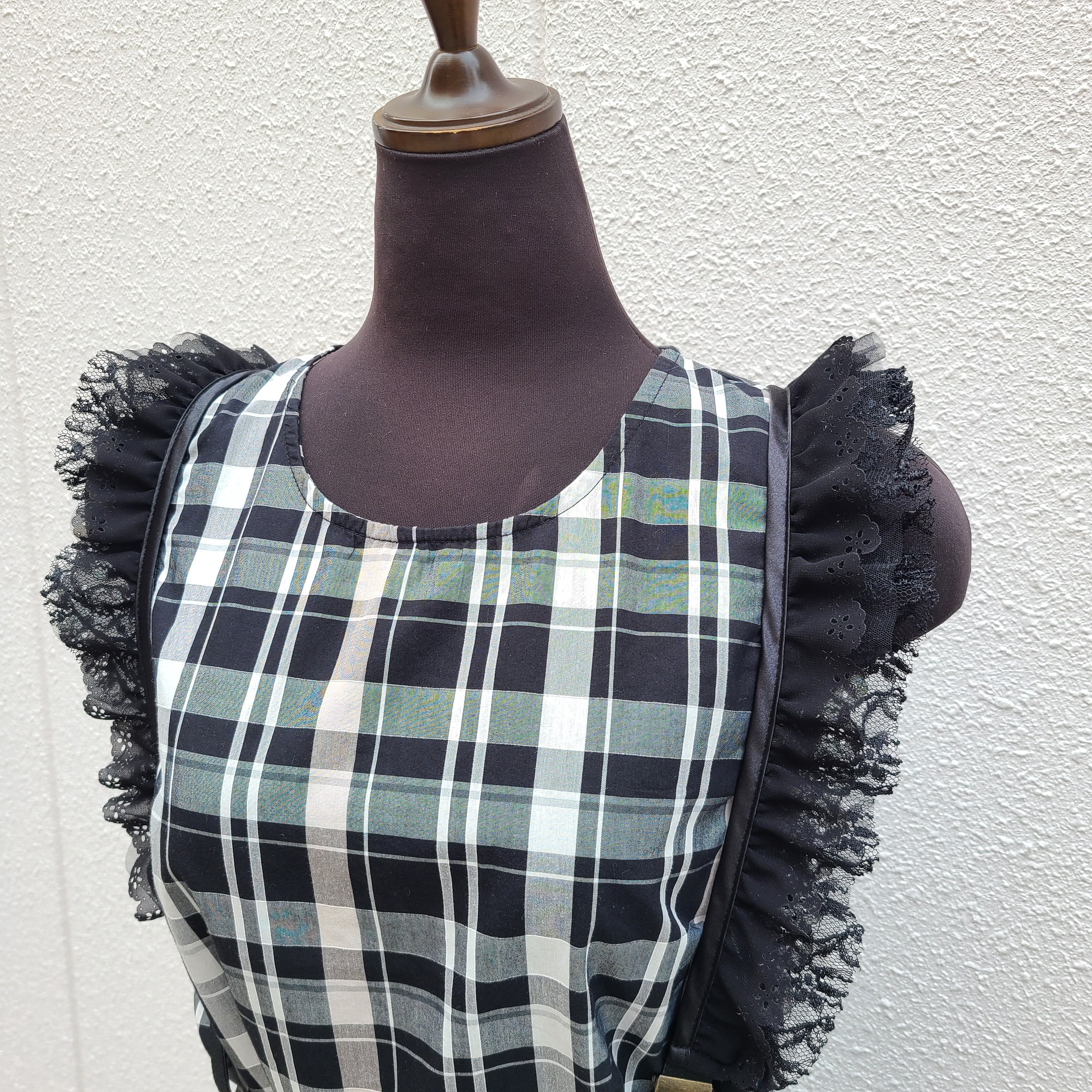 1段目のフリルは超音波カットミシンという特殊ミシンで、花柄スカラップ柄にカットしたシフォン。